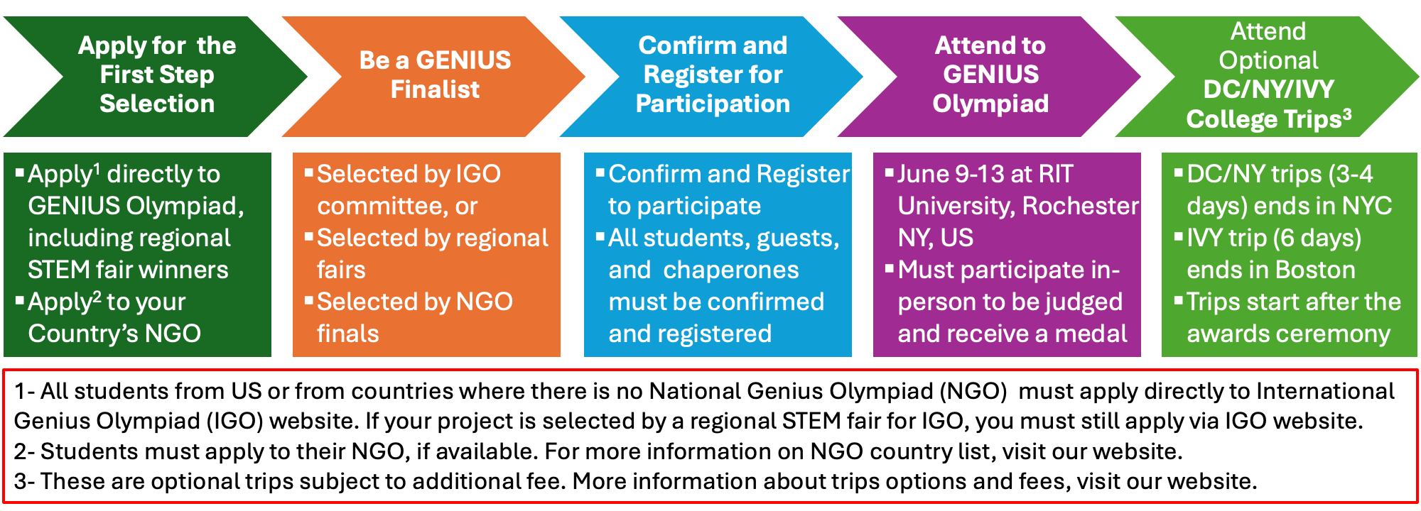 Following table describes the International GENIUS Olympiad application and event process.